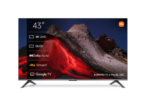 Xiaomi TV A Pro 43 (2026) — 4K UHD 60 Hz (MEMC jusqu’à UHD 60 Hz), Google TV (Chromecast & Assistant), Dolby Audio + DTS:X / DTS® Virtual:X, stéréo 2 × 10 W, Quad-core A55 + Mali-G52 MP2, 2 Go RAM / 8 Go. Design bezel-less cadre métal. HDMI ×3 (eARC), USB, LAN, optique, jack 3,5 mm, CI+. Wi-Fi 2,4/5 GHz + BT 5.0. VESA 200×200.